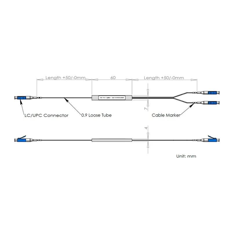 1 × 2 PLC SPLETER STEEL TUBE pakki 60x7x4mm, með 900μm lausri rörlengd 1,0m, LC/UPC tengi.
