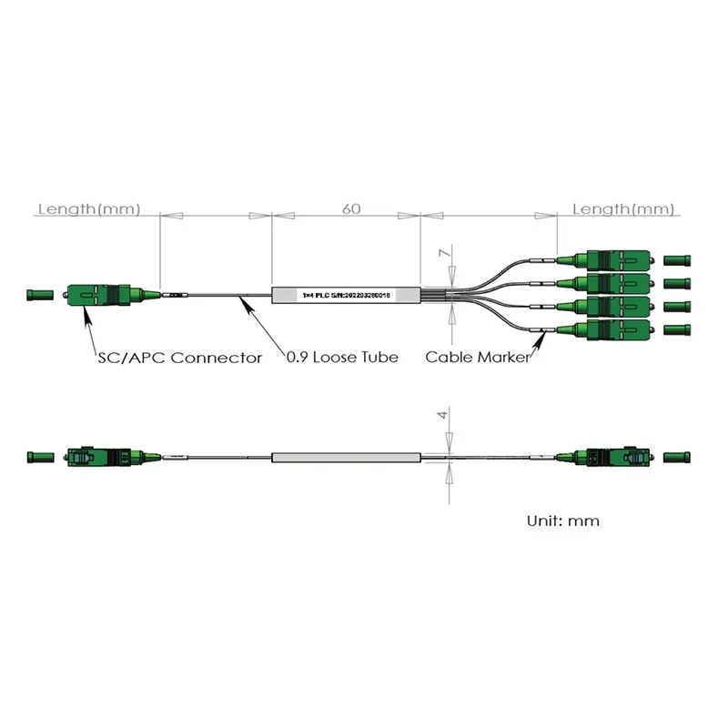 1x4/1 × 8 PLC SLIPTER STEEL TUBE pakki 60x7x4mm, með 900μm lausum rör 1,0+0,1/-0m, SC/APC tengi.