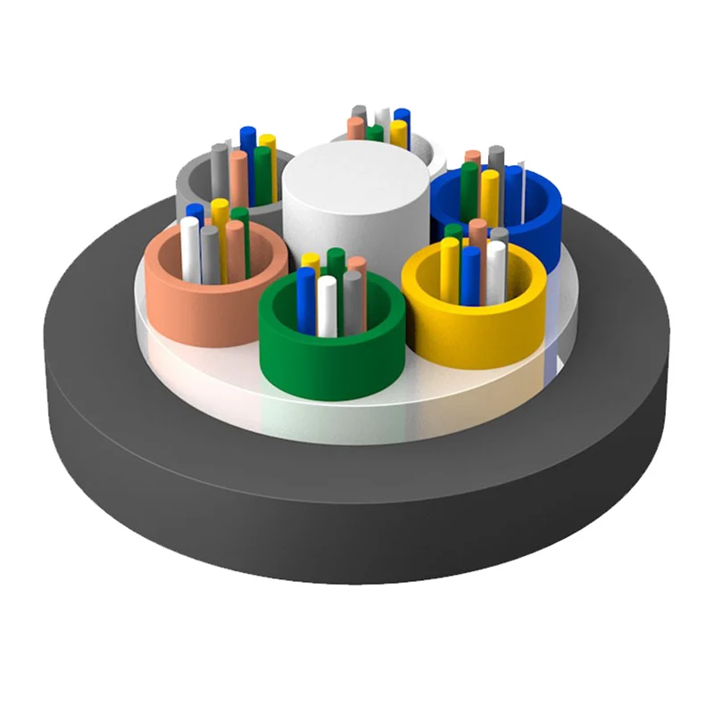 Uppbygging strandaðs lausra rörs sem ekki er málmstyrkur, sem ekki er vopnaður ljósleiðari, er að setja 250 μm sjóntrefjar í lausa rör úr háu stuðulefni og lausa rörið er fyllt með vatnsþéttu efnasambandi. Miðja kapalkjarnans er FRP og lausa rörið (og fyllingar reipið) er snúið um FRP til að mynda samningur og kringlótt kapalkjarna. Bilin í kapalkjarnanum eru fyllt með vatnsblokkandi fylliefni. Lag af pólýetýlen slíðri er kreist utan kapalkjarnans til að mynda snúru.